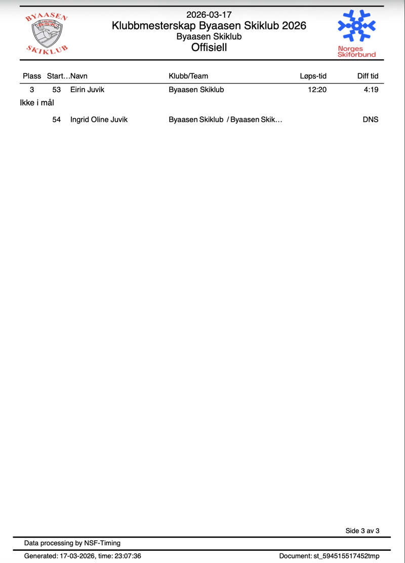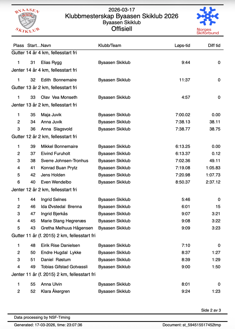 Årets klubbmesterskap ble arrangert av ungdoms- og juniorgruppa vår, og de lagde en flott ramme for arrangementet i Granåsen. Det er moro når vi samler oss, både skileik, rekrutter, ungdom, juniorer og foreldre. Felles fellesstart for alle klasser fra og med 11 år og oppover virket som både de yngre og de eldre synes var gøy.